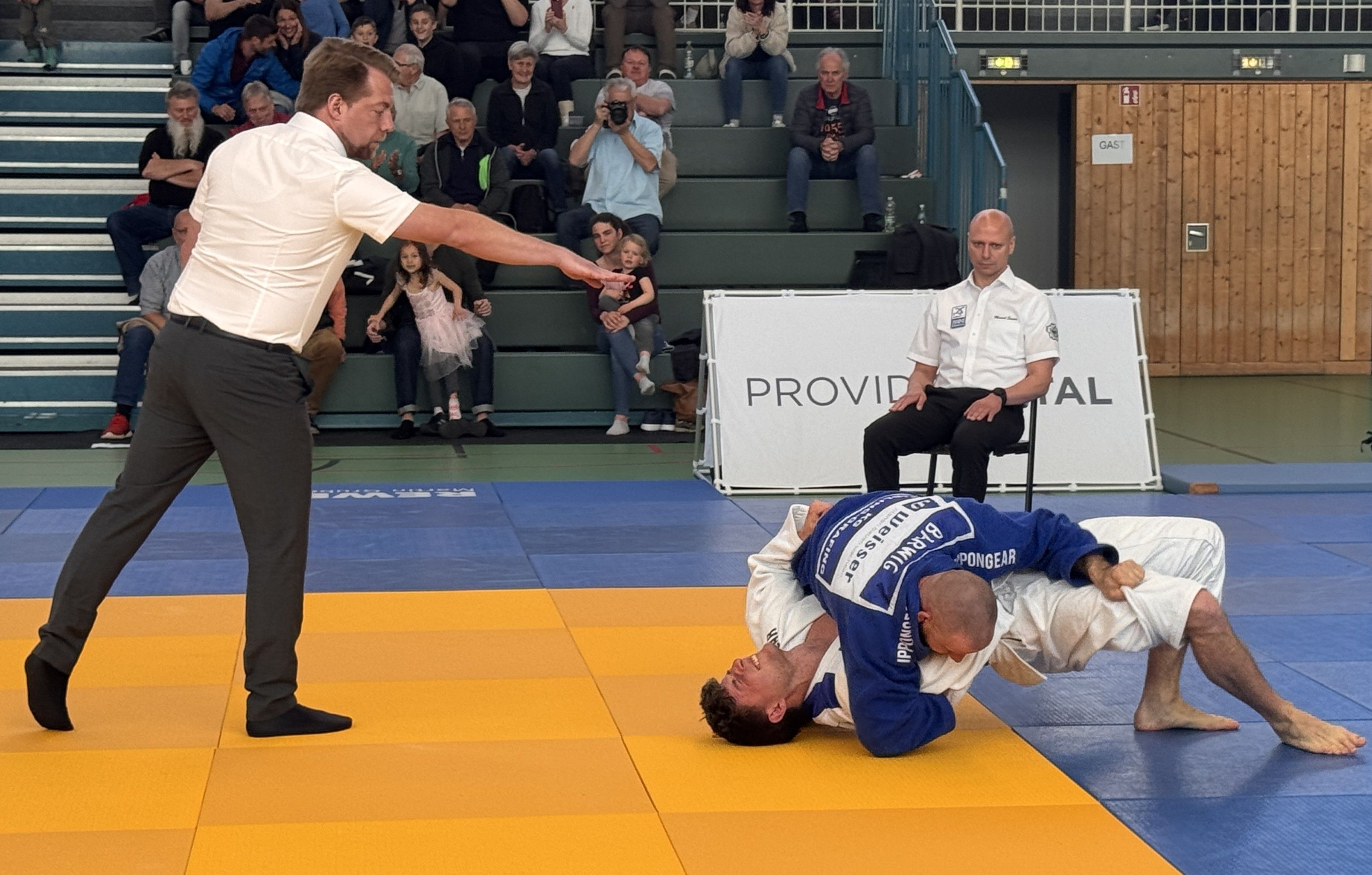 Dass die Kampfgemeinschaft an diesem Tag nicht immer auf Höchstniveau agierte, zeigte sich gleich im ersten Kampf des Tages in der Gewichtsklasse - 73kg. Ian Störmer fand nur schwer in den Kampf und musste früh eine kleine Wertung gegen sich hinnehmen. Den Weckruf nahm Störmer jedoch dankend an und setzte sich nach zweieinhalb Minuten vorzeitig durch – Wettkampfstärke, wenn es darauf ankommt. Maxim Weisser (-60 kg) und Mohamed-Montassar Rouahi (+100 kg) stellten im Anschluss souverän auf 3 : 0 für die Gastgeber. Mukhamed Takhaev (-66 kg) musste sich Leon Koch geschlagen geben. „Momo hat im ersten Durchgang nicht zu seinem Judo gefunden. Das ist in erster Linie schade für ihn selbst, denn er ist extrem ehrgeizig und hat Talent für drei. Aber man darf nicht vergessen, dass der Junge gerade 17 Jahre alt geworden ist – da sind Schwankungen völlig normal“, so Garic. In der Gewichtsklasse -100 kg gab der Österreicher Michael Niederdorfer ein glänzendes Debüt für die Kampfgemeinschaft. In knapp über einer Minute ließ er seinem Gegner Nils Ruhland keine Chance und siegte ungefährdet. Philipp Ampletzer zeigte in seiner neuen Gewichtsklasse -81 kg eine der besten Leistungen des Tages. Souverän und routiniert besiegte er Mensur Osmani durch eine schöne Kombination an Techniken im Bodenkampf. Im Anschluss siegte auch Robert Barwig (-90 kg) souverän im Boden und sorgte für ein komfortables Halbzeitergebnis von 6 : 1 für die Hausherren.