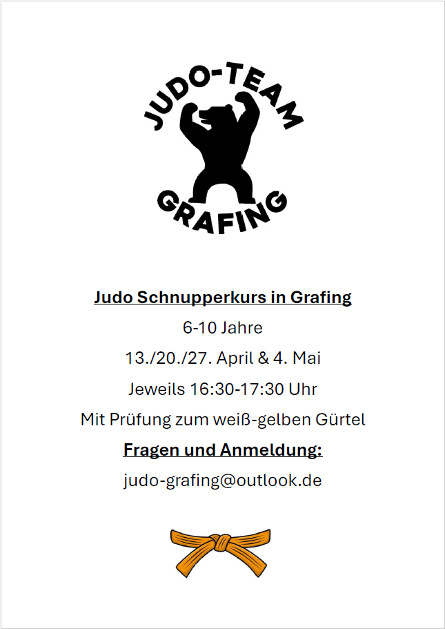 Trainingsbetrieb Judo Schnupperkurs April 2026 18.03.2026 Wir starten den nächsten Schupperkurs für Judo in Grafing! :-)Anmeldung per E-Mail.